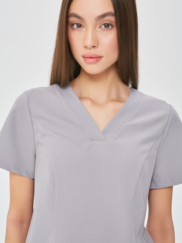 ✔ Приталенная медицинская рубашка с V-образным вырезом и накладными карманами.